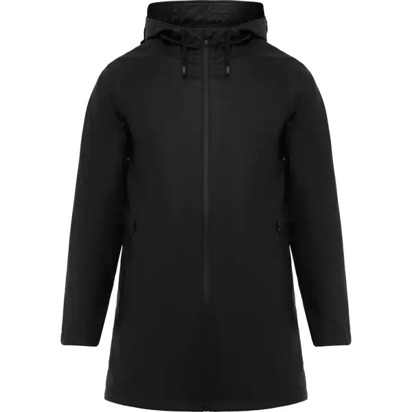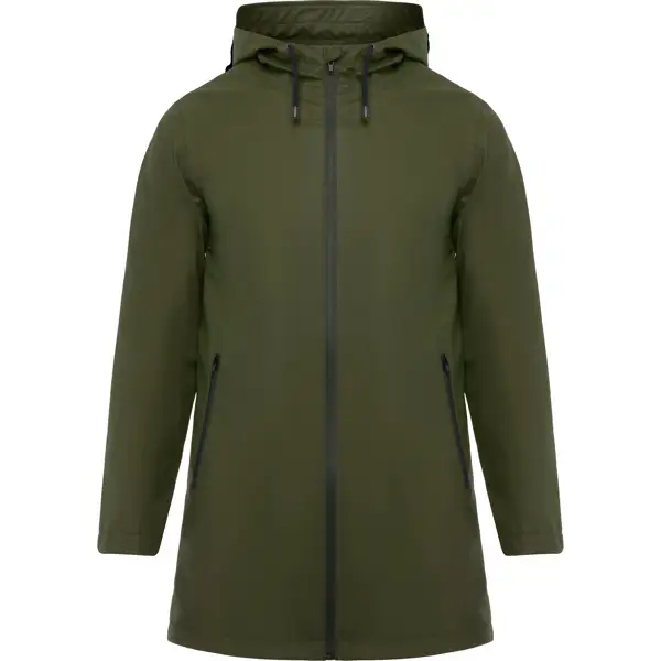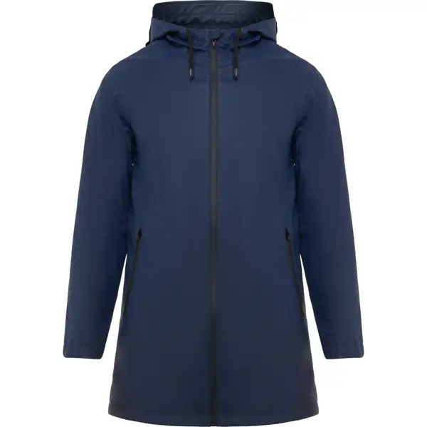 Płaszcz przeciwdeszczowy wodoodporny ze stałym kapturem i daszkiem. Dwukierunkowy zamek błyskawiczny z przodu, kieszenie boczne i zgrzewane szwy. Regulowany ściągacz w kapturze. Otwór tylny. Dostęp do wnętrza w celu dalszych procesów produkcyjnych.