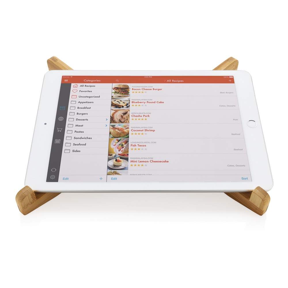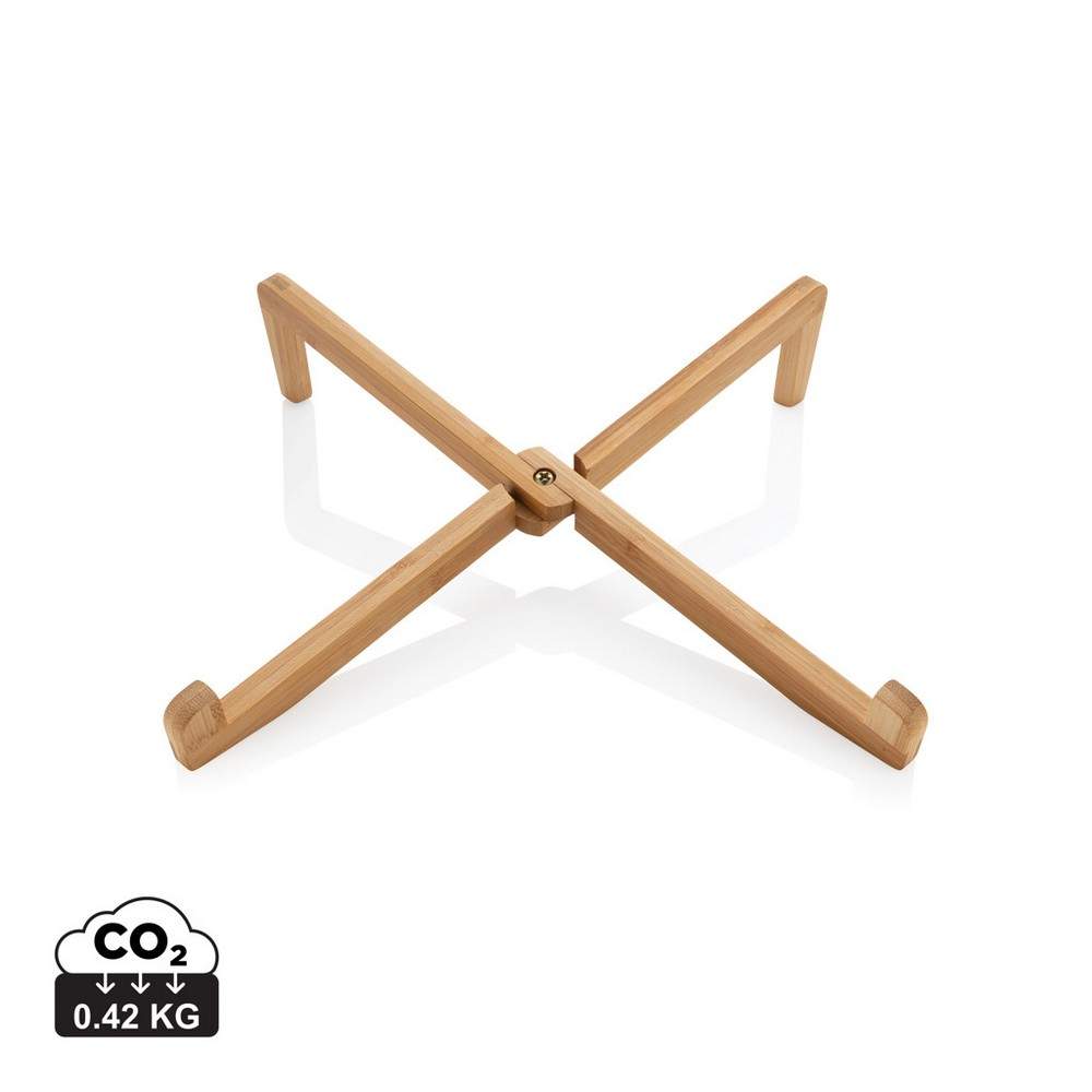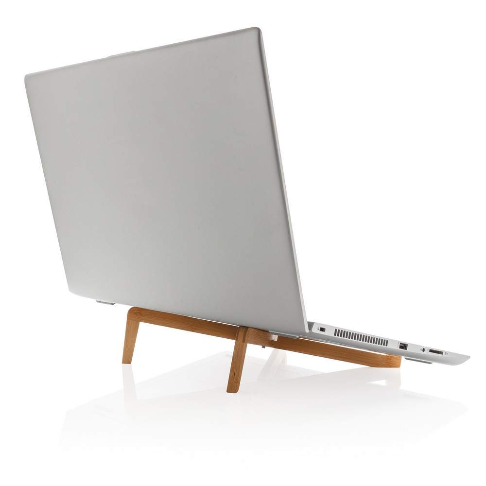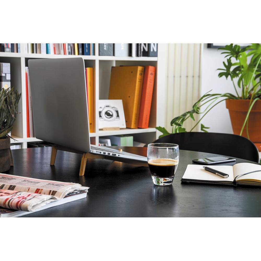 Składany stojak na laptopa, tablet, wykonany z wytrzymałego, naturalnego bambusa, podstawka zapewnia odpowiedni poziom cyrkulacji powietrza pod urządzeniem oraz właściwe położenie ekranu, kompatybilny z laptopami do 15,6", może również służyć jako stojak na książkę, bawełniane etui w komplecie, ślad węglowy produktu: 0,42 kg CO2