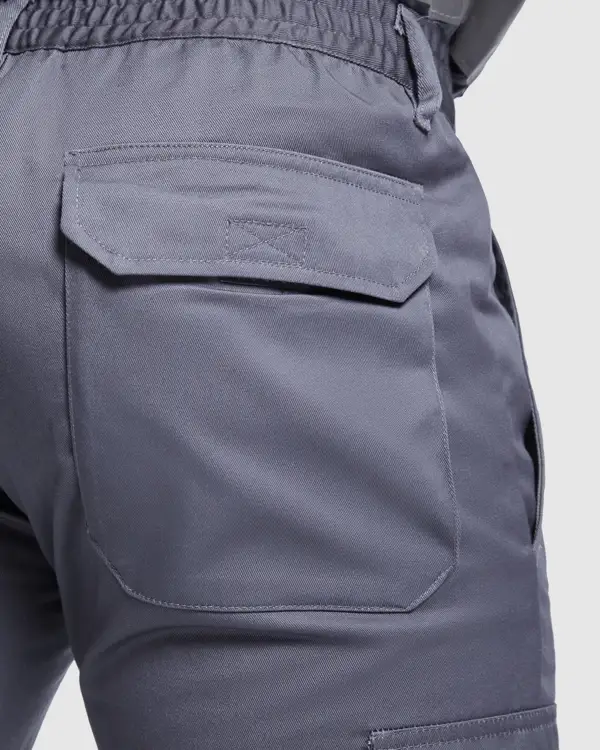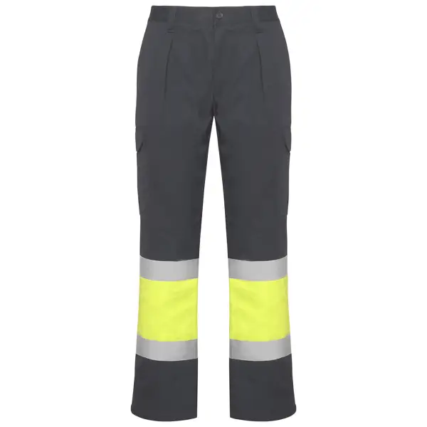 Dwukolorowe spodnie o wysokiej widoczności z wieloma kieszeniami.·Wytrzymała tkanina.·Elastyczny pas z tyłu.·Dwie przednie kieszenie.·Dwie tylne kieszenie z klapkami i zapięciem na rzep.·Dwie kieszenie cargo z klapkami i zapięciem na rzep.·Dwa odblaskowe paski na nogawkach.·Panele fluorescencyjne pomiędzy odblaskowymi paskami.·Zewnętrzna etykieta Roly WRK.·Program prania: x25