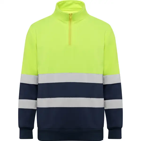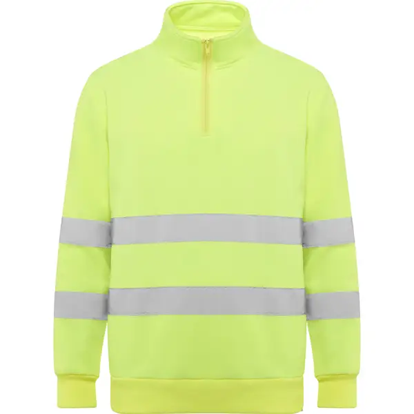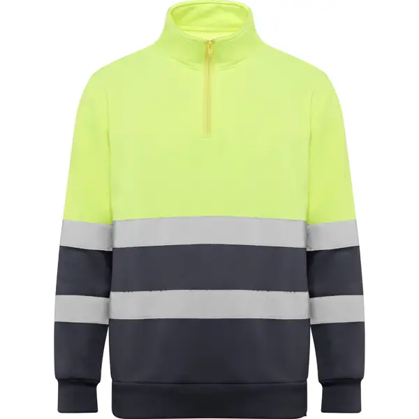 Bluza dresowa o wysokiej widoczności z zamkiem błyskawicznym rozpinanym do połowy. ·Wysoki kołnierz z osłoną podbródka wykonaną z tej samej tkaniny. ·Prążkowane mankiety i obszycie 1x1. ·Dwa odblaskowe paski na tułowie i po dwa na rękawach·Dostępne w jednolitych lub kontrastowych opcjach kolorystycznych. ·Zewnętrzna etykieta Roly WRK.·Program prania: x25