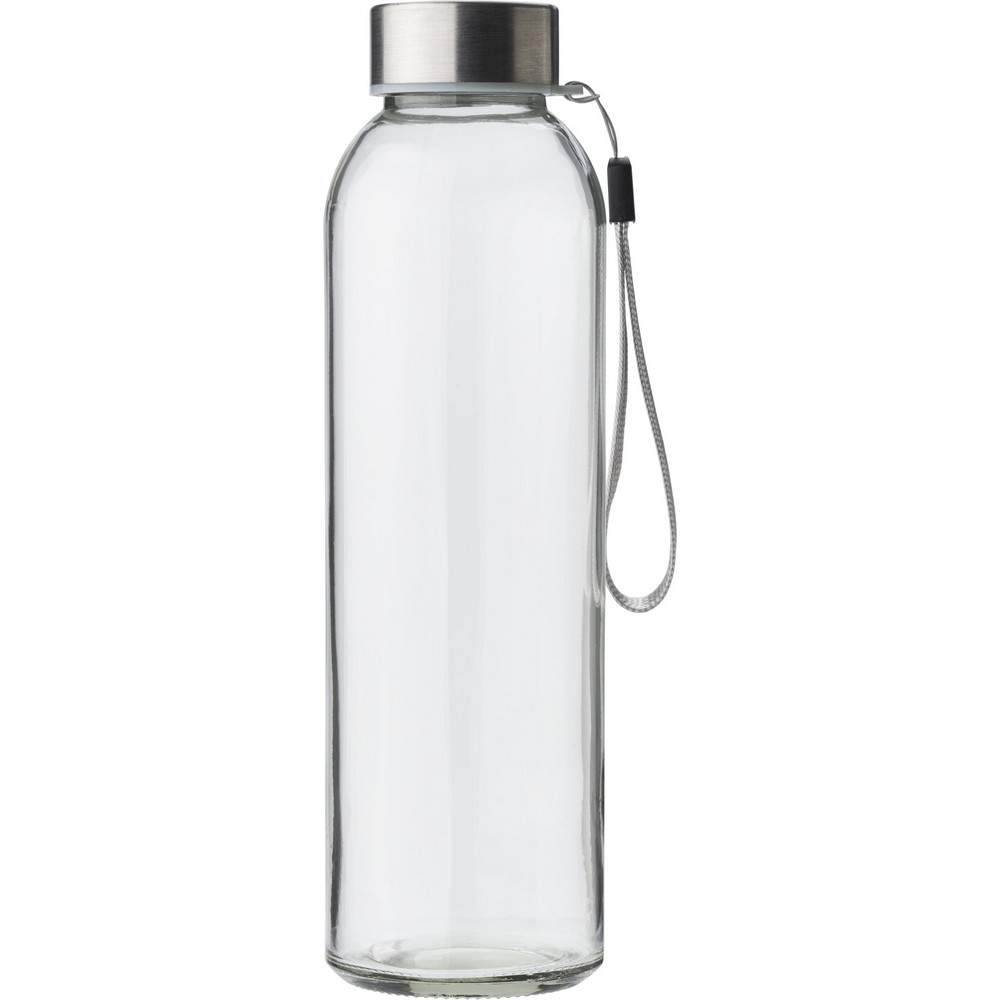 Szklana butelka 500 ml w pokrowcu, metalowa zakrętka z uchwytem, odpowiednia wyłącznie do zimnych napojów