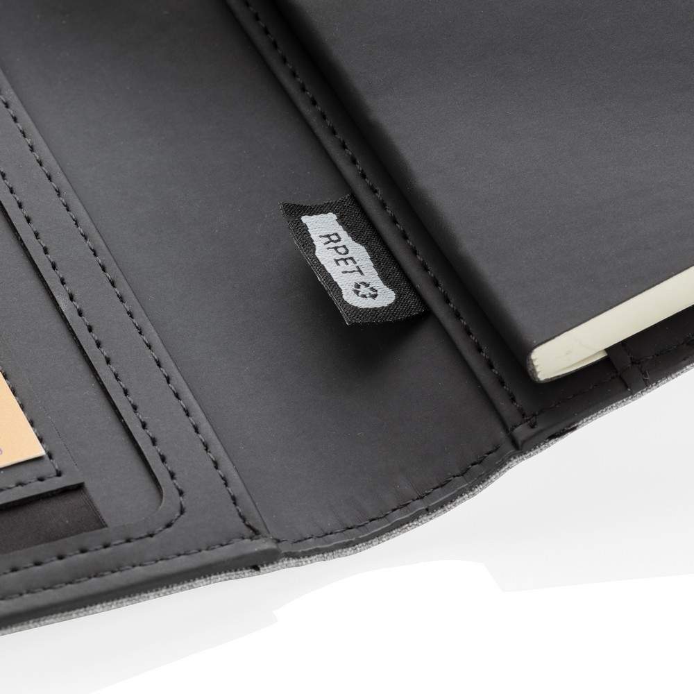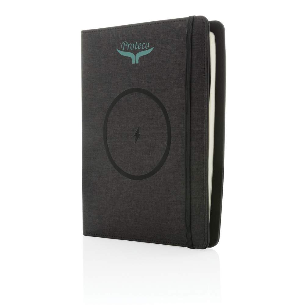 Teczka konferencyjna A5 wykonana z rPET, bezprzewodowy power bank 5000 mAh, ładowarka bezprzewodowa 5W na przedniej stronie okładki, port USB do ładowania urządzeń za pomocą kabla, bezprzewodowe ładowanie jest kompatybilne ze wszystkimi urządzeniami posiadającymi możliwość ładowania indukcyjnego, wejście 5V/2.1A, wyjście 1: 5V/2.1A, wyjście 2: 5V/2.1A, wyjście bezprzewodowe 5W, wzór zastrzeżony®, ślad węglowy produktu: 4,45 kg CO2