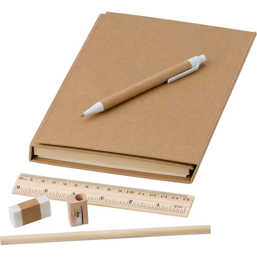 Teczka konferencyjna, notatnik (40 kartek w linie), bambusowa linijka (15 cm), papierowy długopis z plastikowymi elementami korpusu, 2 ołówki, temperówka, gumka do mazania, 125 karteczek samoprzylepnych (25 szt. z każdego koloru), notatnik samoprzylepny i kieszeń wewnętrzna