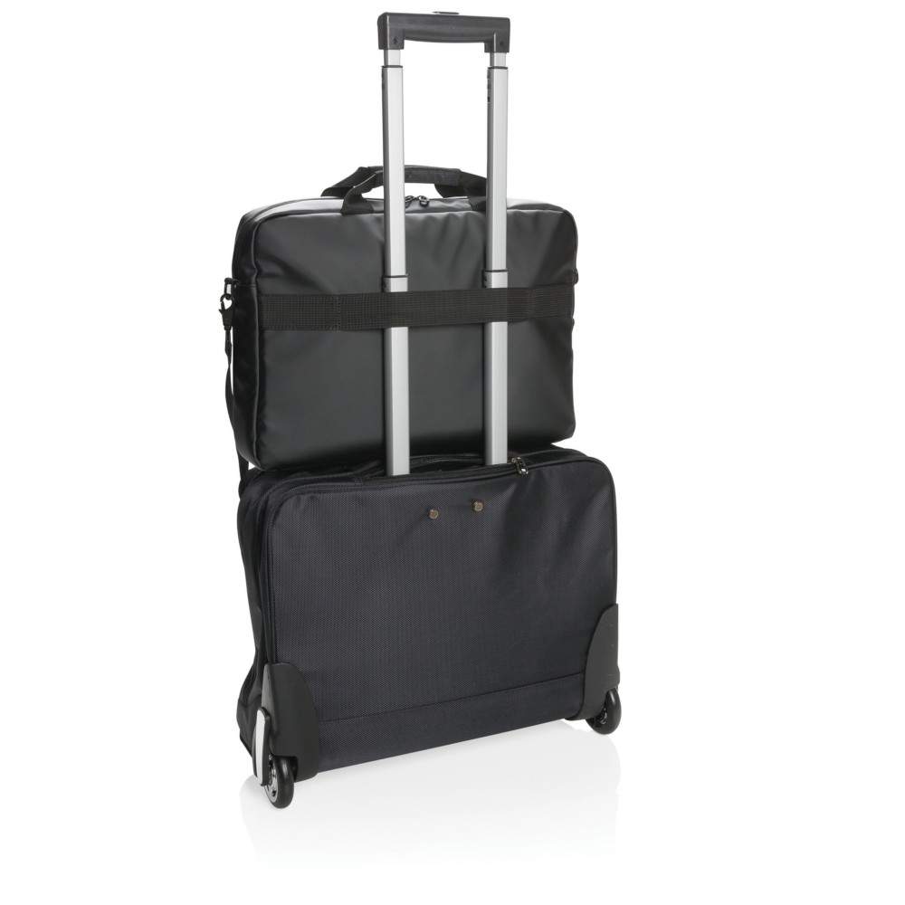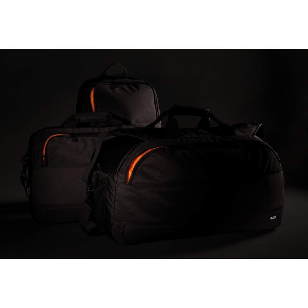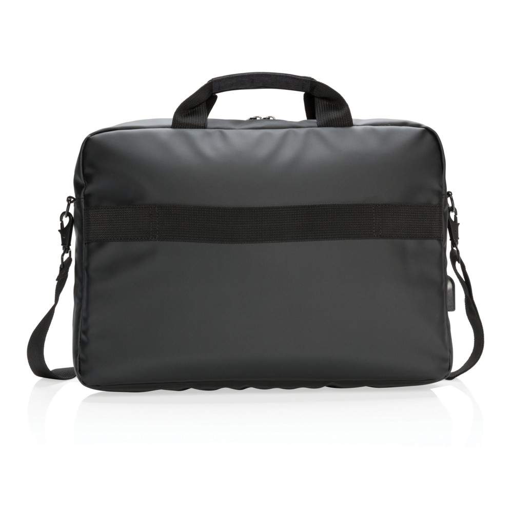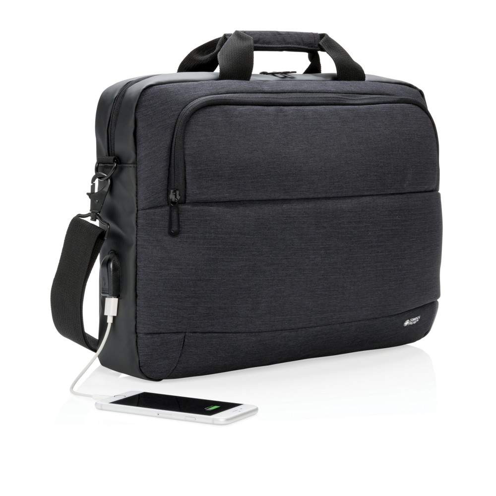 Torba na laptopa 15", wykonana z poliestru, przegroda z przodu oraz główna na laptopa, zintegrowany port USB do ładowania (power-bank nie jest dołączony), pasek do zamocowania na walizce, pasek na ramię, ślad węglowy produktu: 4,24 kg CO2