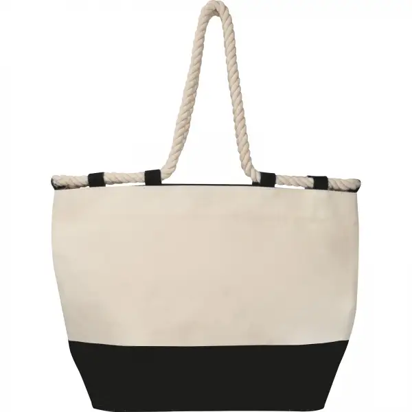Torba z juty z uszami wykonanymi z grubego sznura, który służy do noszenia torby, a także do jej zamykania.