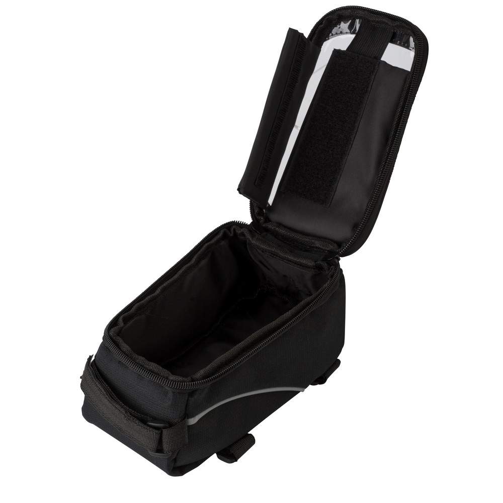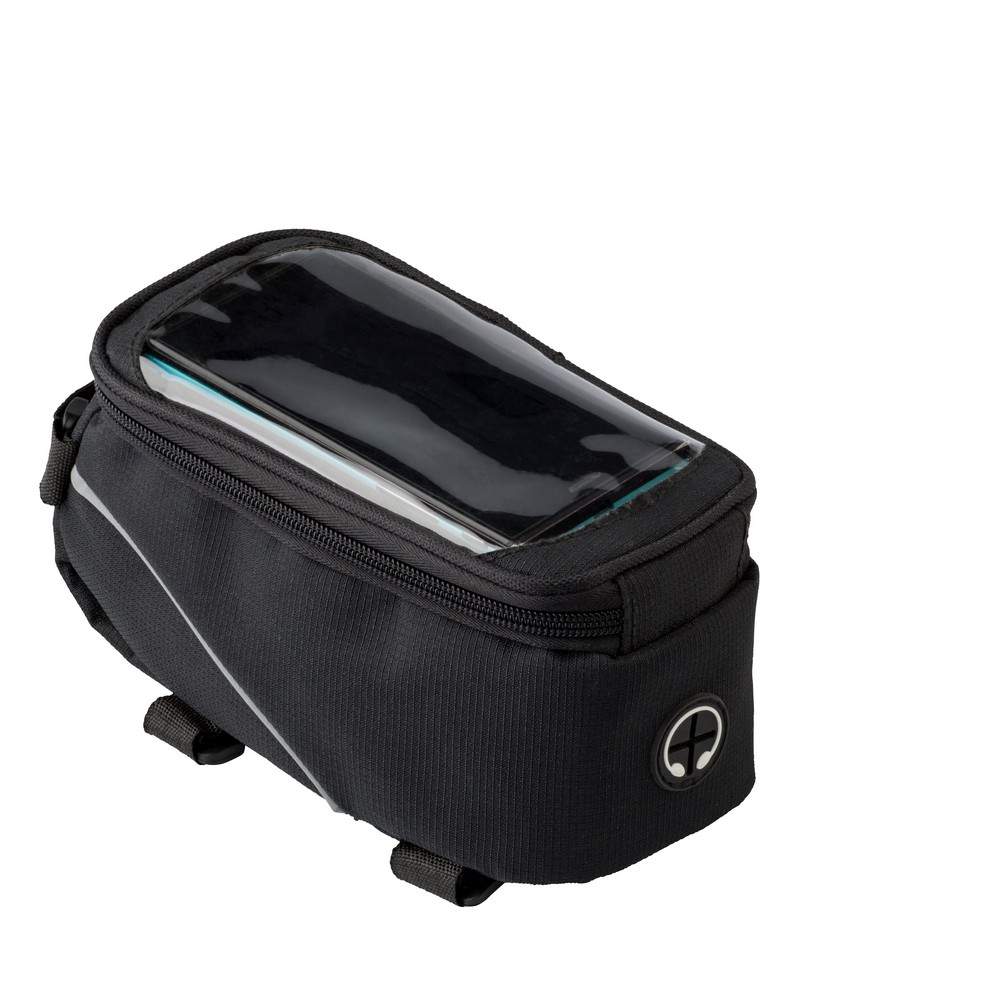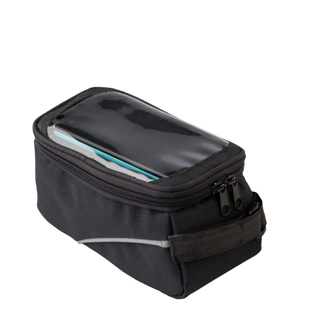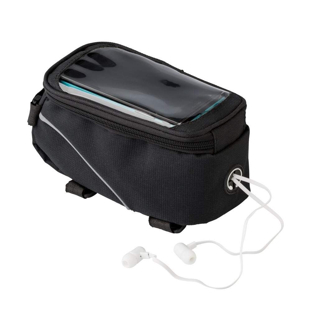 Torba rowerowa, przegroda główna zamykana na zamek błyskawiczny, kieszeń na telefon z transparentnym okienkiem umożliwiającym obsługę ekranów dotykowych, wyjście na słuchawki, mocowana na rzep