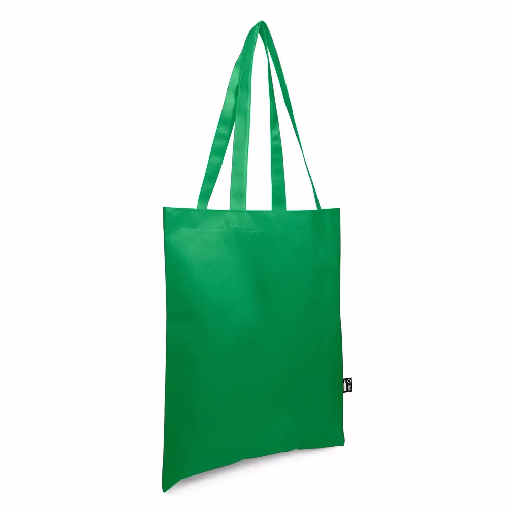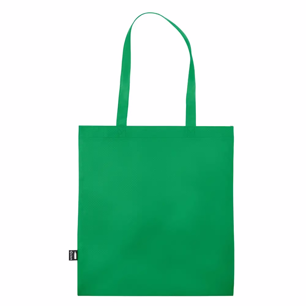 Torba na zakupy wykonana z RPET, posiada długie uchwyty umożliwiające noszenie na ramieniu, ikona RPET na metce, produkt wykonany z non-woven RPET 75 g/m2