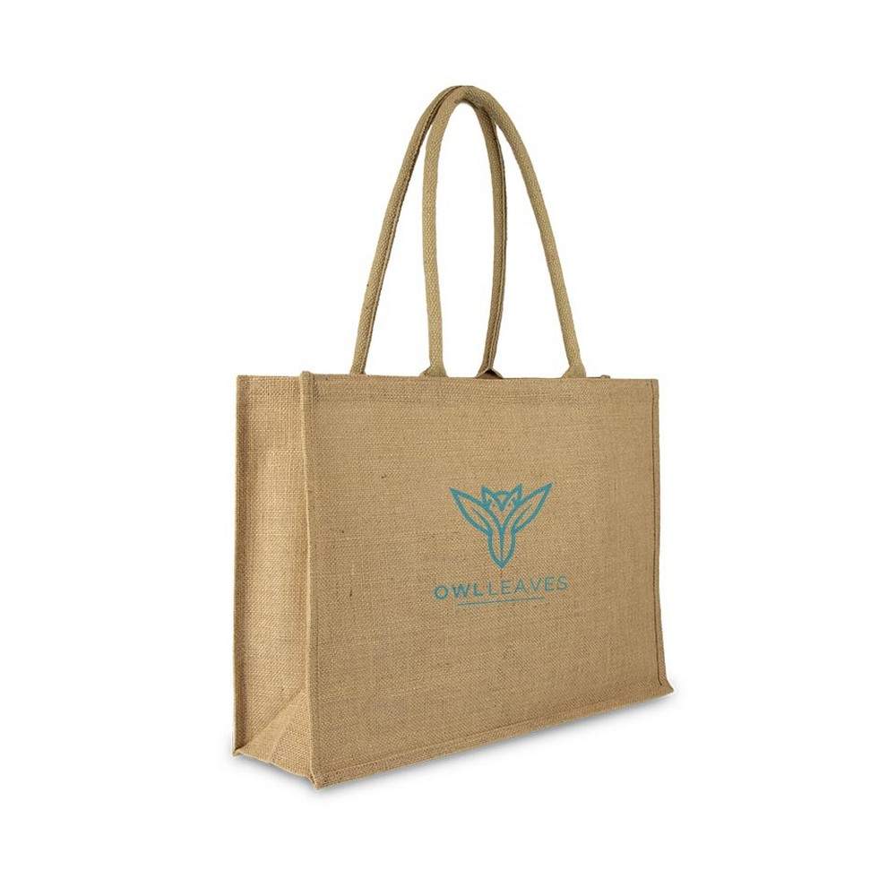 Torba na zakupy z laminowanym wnętrzem, które zmniejsza ryzyko rozdarcia materiału, posiada długie uchwyty umożliwiające noszenie na ramieniu, produkt wykonany z laminowanej juty o gramaturze 340 g/m2