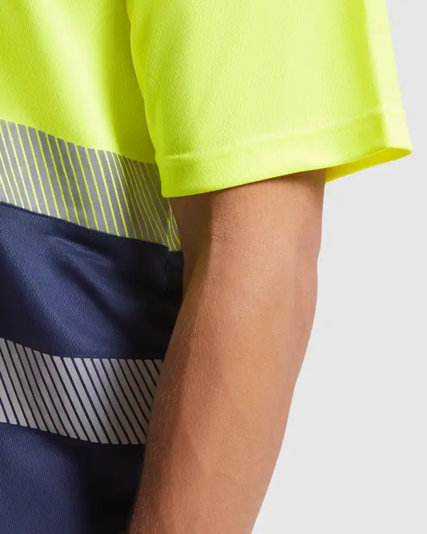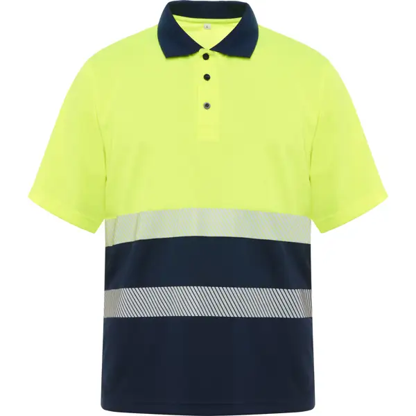 Dwukolorowa koszulka polo z krótkim rękawem o wysokiej widoczności.·Oddychająca tkanina techniczna. ·Dwa segmentowe paski na tułowie.·Prążkowany kołnierz 1x1.·Rozcięcie z 3 kontrastowymi guzikami. ·Opcjonalna kieszeń. ·Miękka taśma kryjąca przeszycie na karku.·Zewnętrzna etykieta Roly WRK.·Program prania: x25