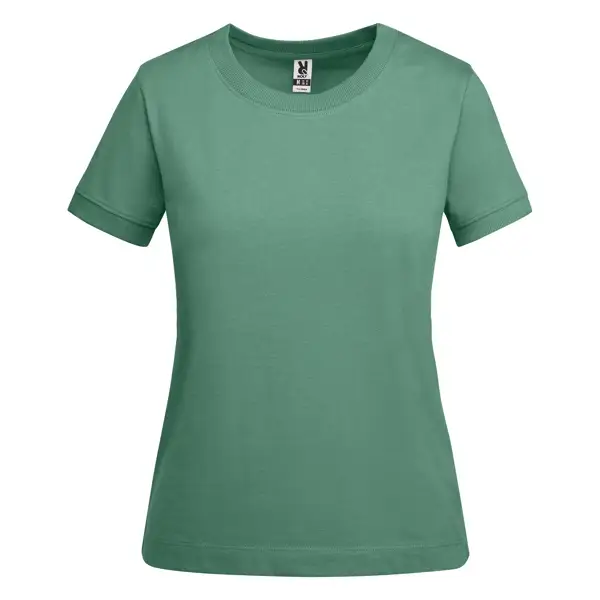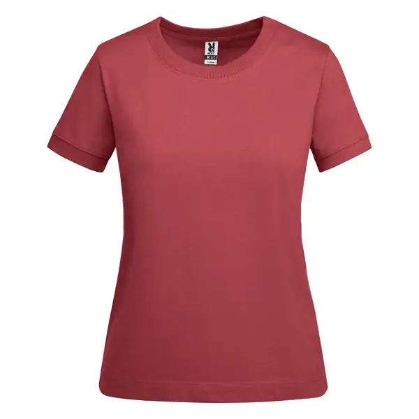 T-shirt dla kobiet z krótkim rękawem wykonany z grubej bawełny. Szeroki okrągły dekolt i obszycie rękawów ze ściągaczem 2x1. Wzmocnione, ukryte szwy w kołnierzu. Boczne szwy. Dopasowane logo Roly na obszyciu po lewej stronie. Szeroki szew na obszyciu.