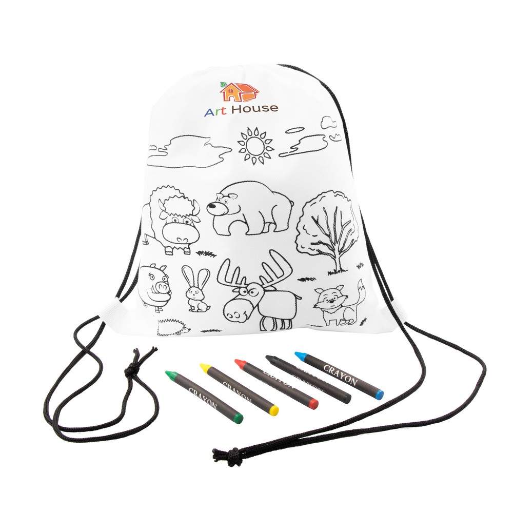 Worek ze sznurkiem umożliwiającym noszenie na plecach, kolorowanka z motywem zwierząt na froncie, 5 kredek świecowych w komplecie, produkt wykonany z materiału non-woven