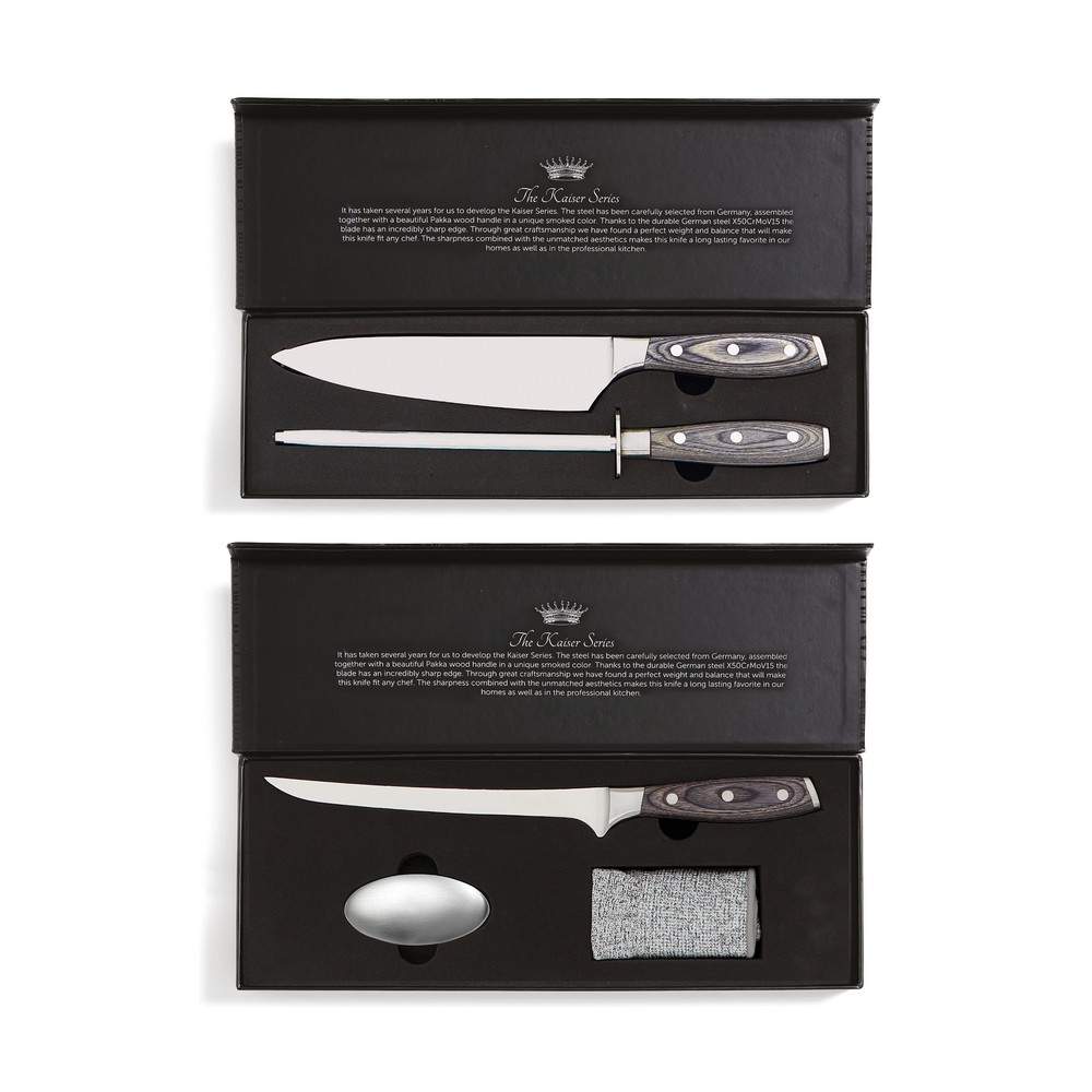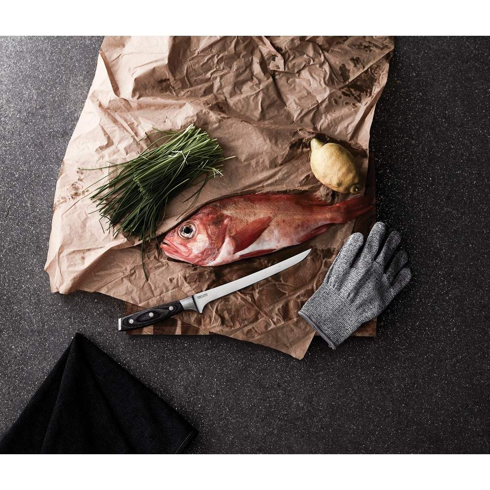 Zestaw do filetowania ryb, nóż do filetowania, rękawiczka z siatki stalowej, metalowe mydło, które usuwa zapach ryb i czosnku, wykonane ze stali nierdzewnej, uchwyt z drewna pakka, w pudełku upominkowym