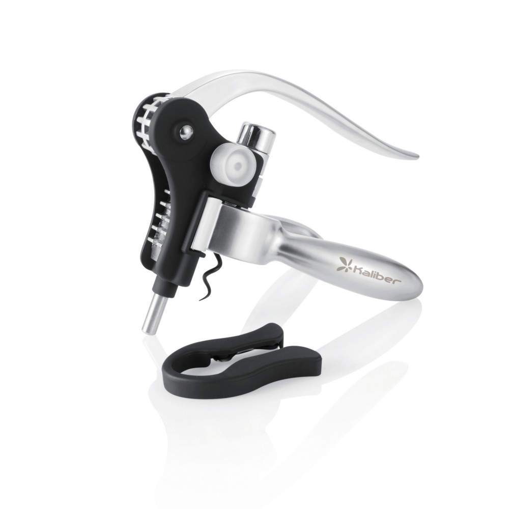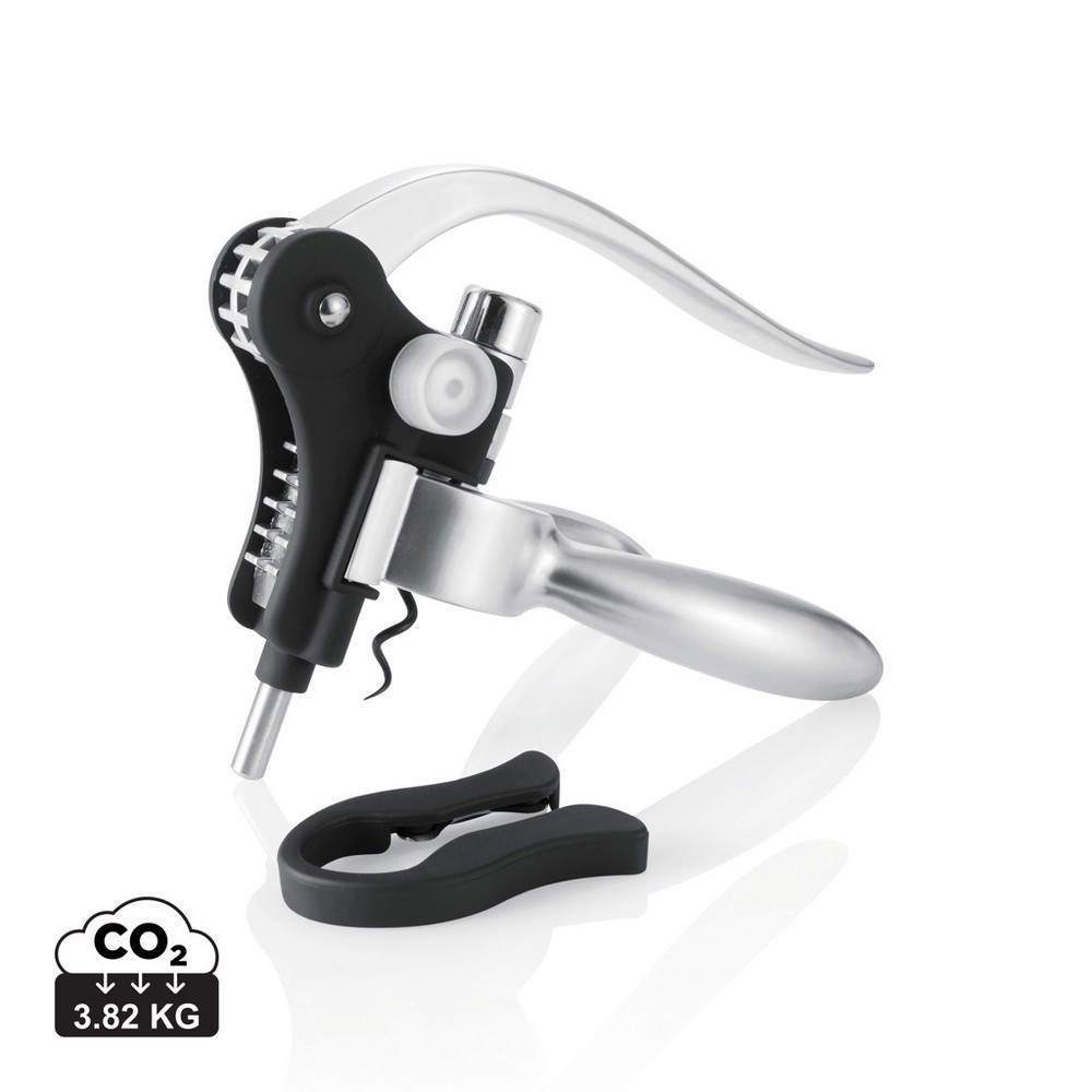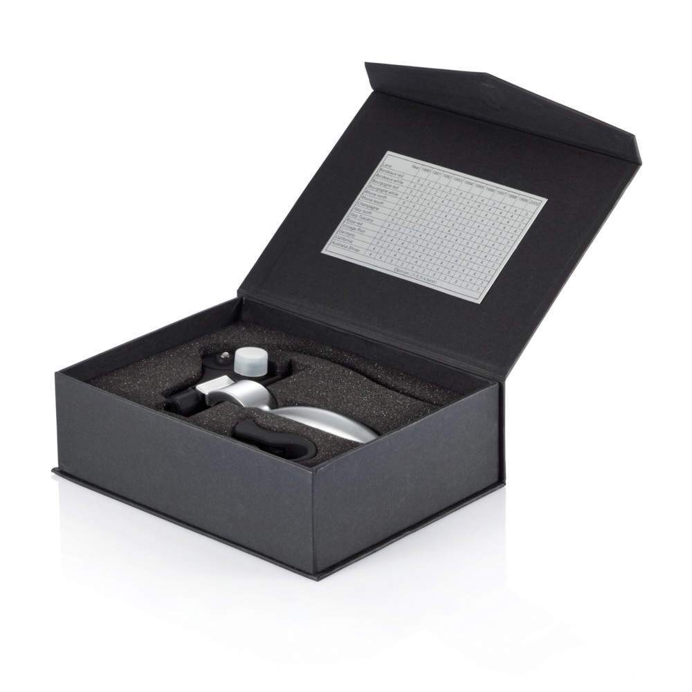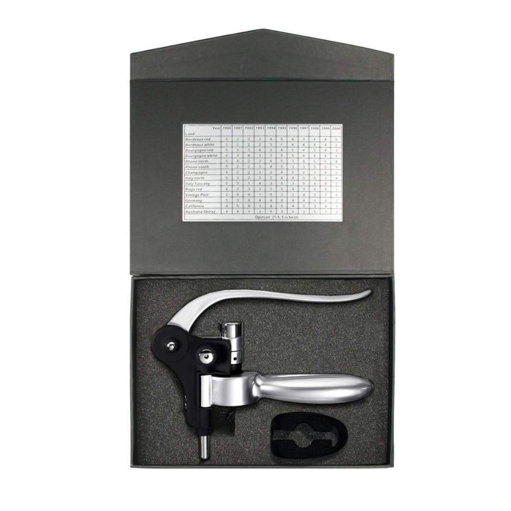 Zestaw do wina, korkociąg z aluminiowym mechanizmem podnoszącym, spirala stalowa, pokryta teflonem, nożyk do folii, w komplecie ozdobne pudełko oraz przegląd najlepszych regionów winnych roku 1990, ślad węglowy produktu: 3,82 kg CO2