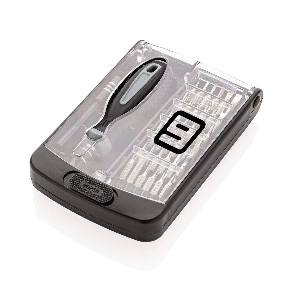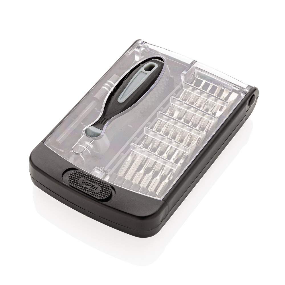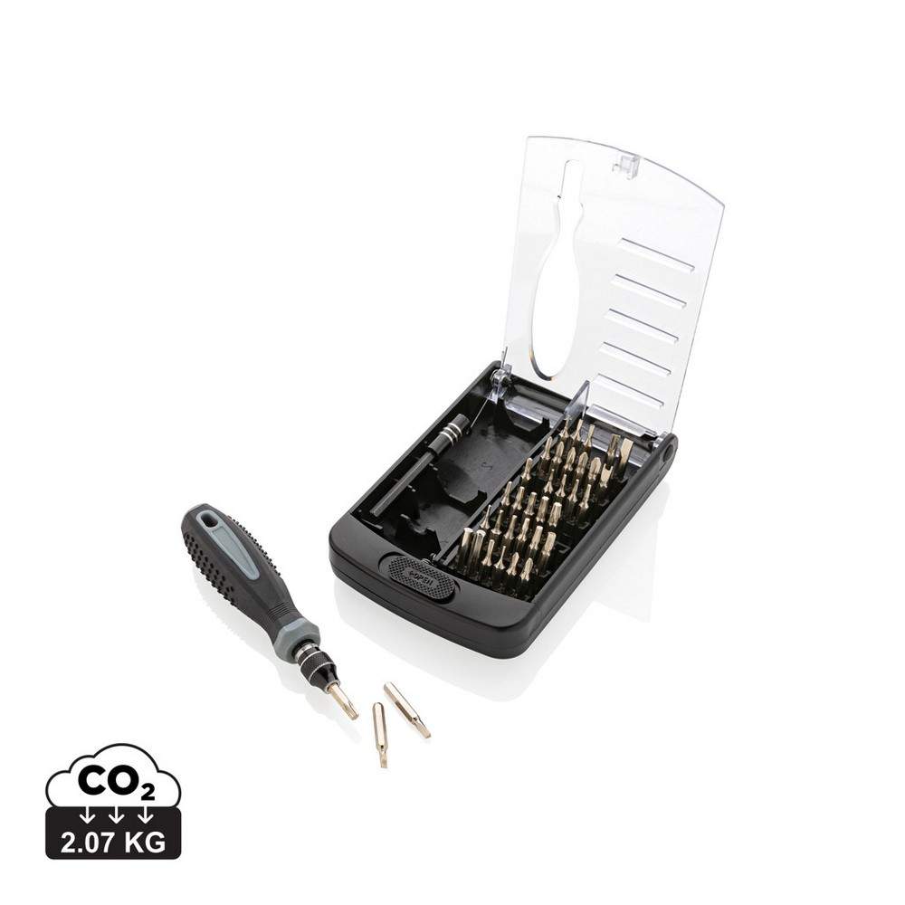 Zestaw narzędzi 38 el., wkrętak wykonany z PP, końcówki ze stali węglowej, w pudełku z ABS z przezroczystym wieczkiem, ślad węglowy produktu: 2,07 kg CO2