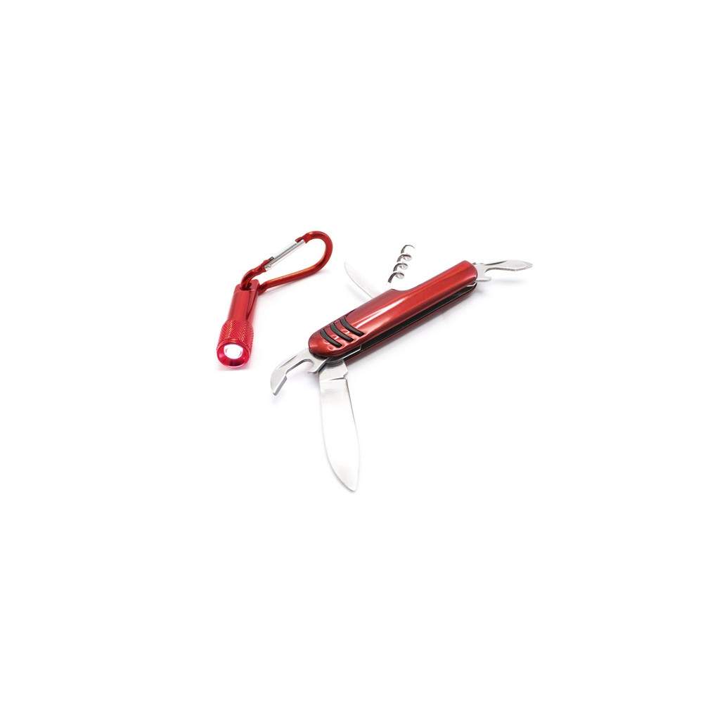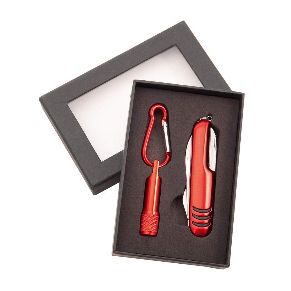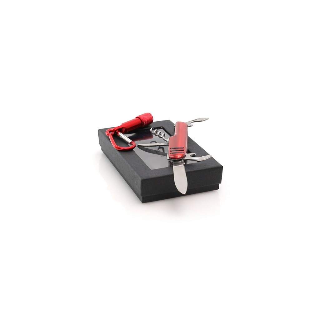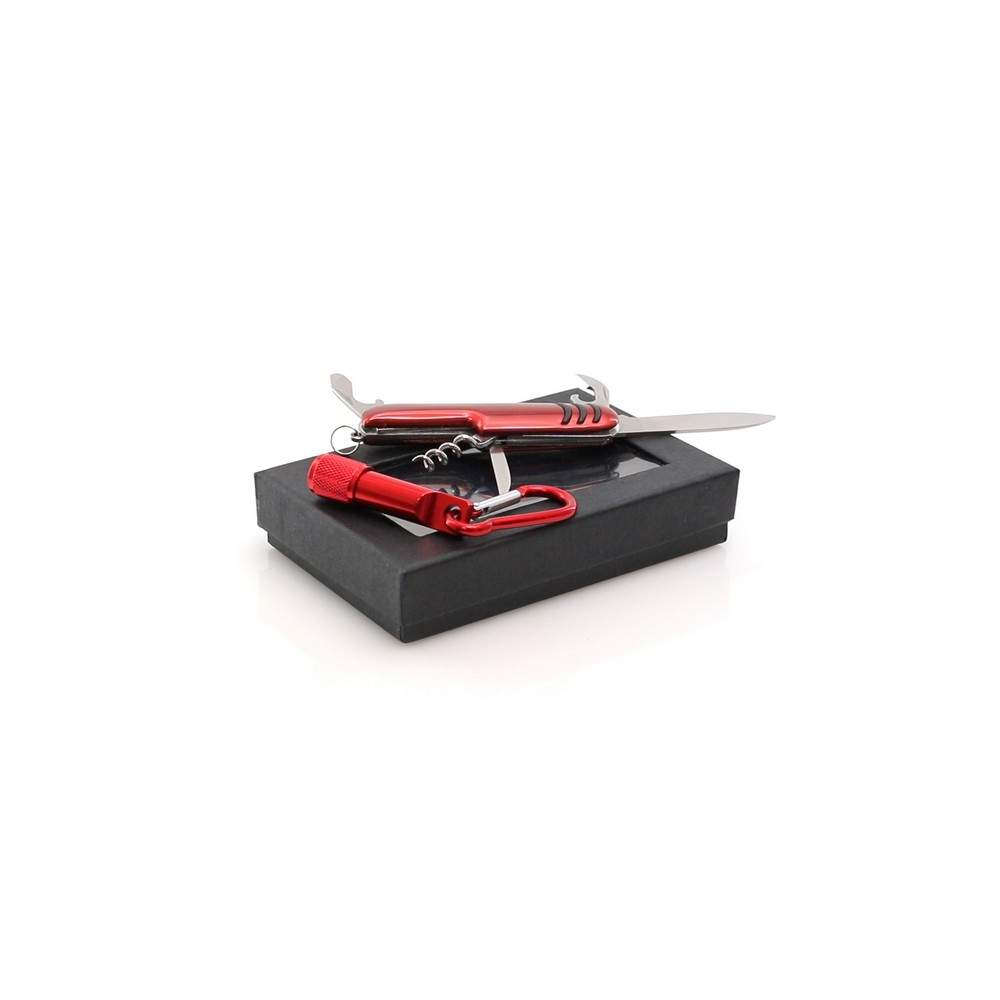 Zestaw w czarnym pudełku: narzędzie wielofunkcyjne, scyzoryk (7 el.) i latarka 1 LED z karabińczykiem