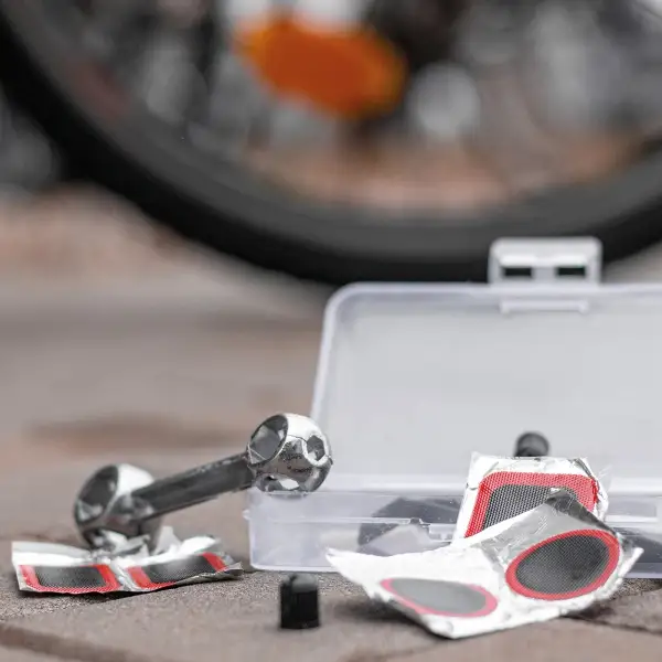 Zestaw narzędzi do naprawy roweru. W zestawie znajduje się listek papieru ściernego, klucz, 5 łatek, 2 wentyle, 2 nakrętki na wentyle oraz 2 łyżki do opon.