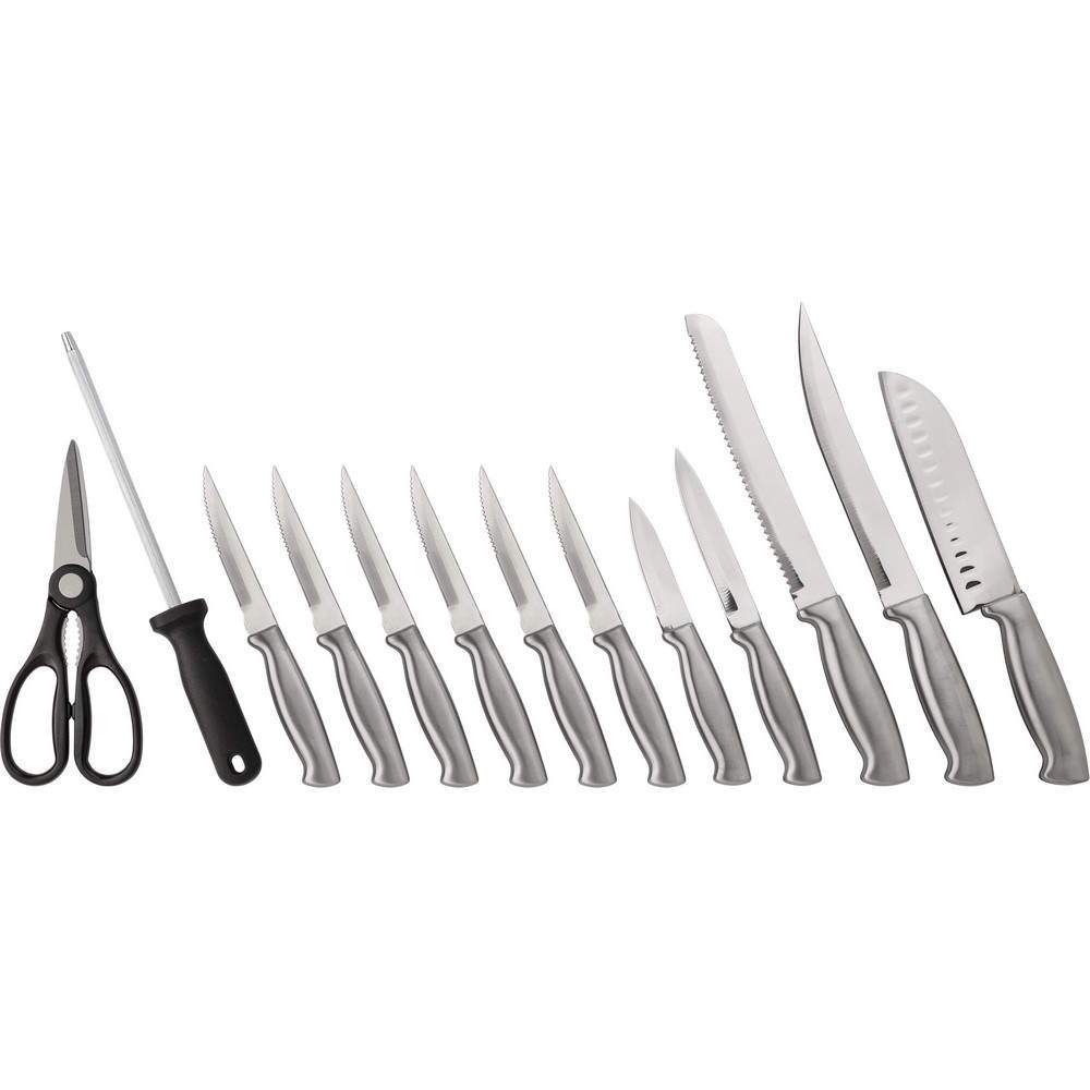 Zestaw noży kuchennych, 14 el., drewniany stojak z gumowymi elementami, nożyczki, ostrzałka i 11 różnych noży