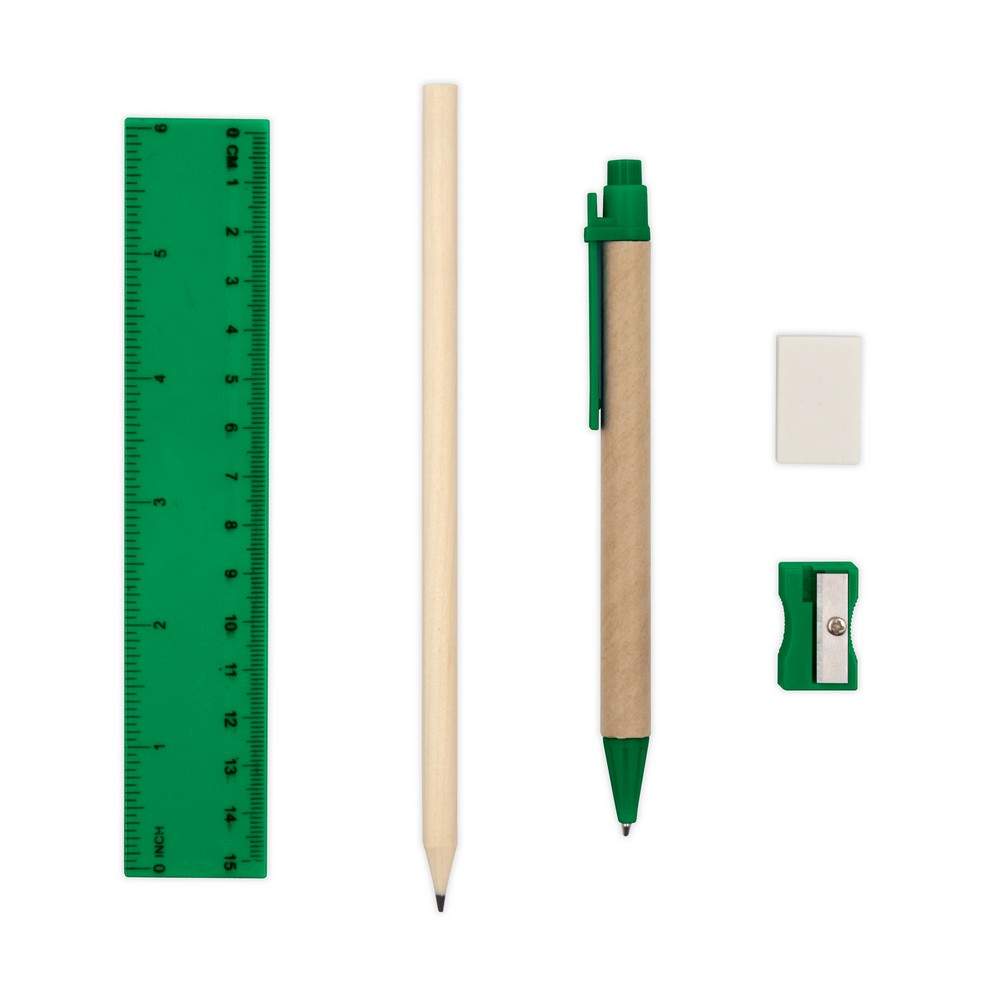 Zestaw szkolny w pudełku, w komplecie znajduje się: ołówek, długopis z trzonem z kartonu z recyklingu (wkład w niebieskim kolorze), linijka (15 cm / 6 cali), gumka oraz temperówka, produkt wykonany z kartonu z recyklingu