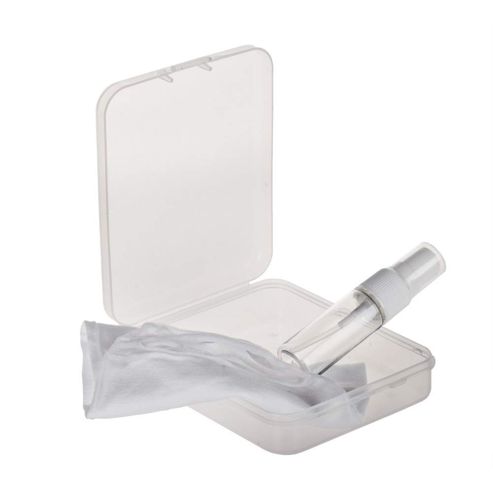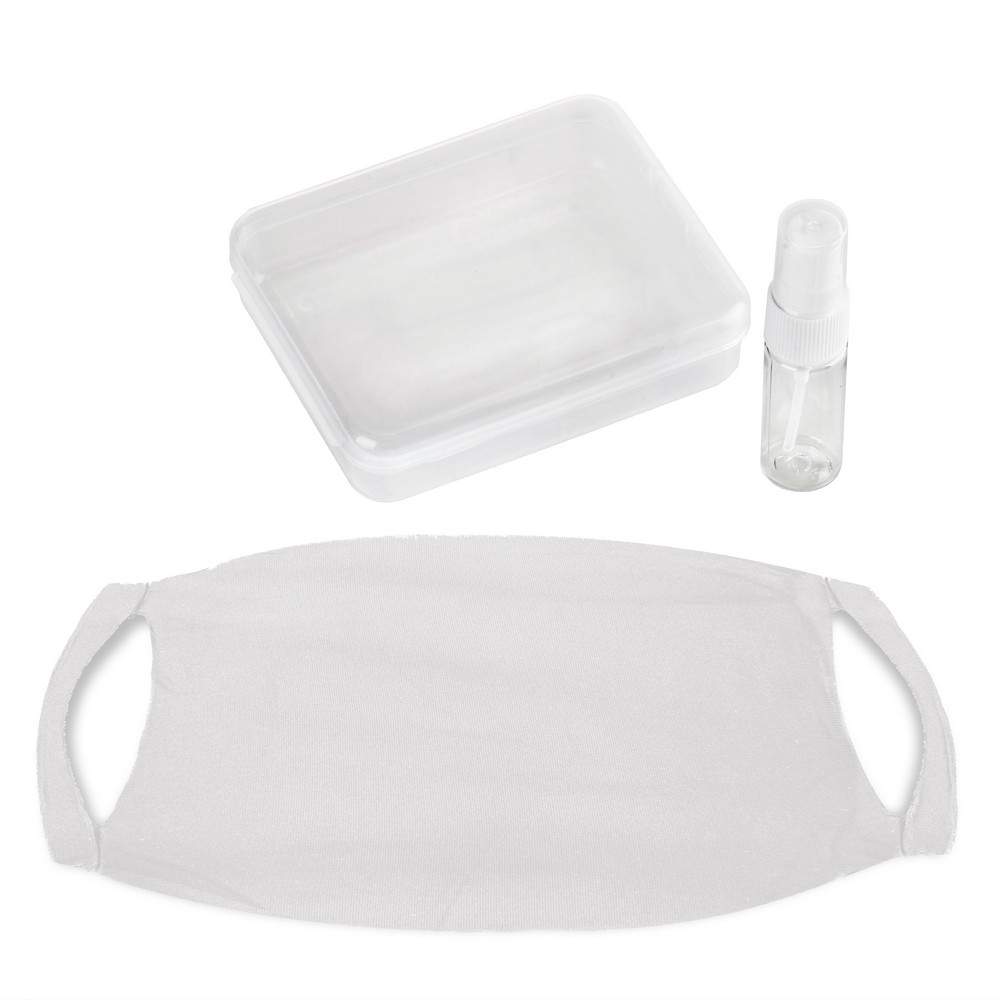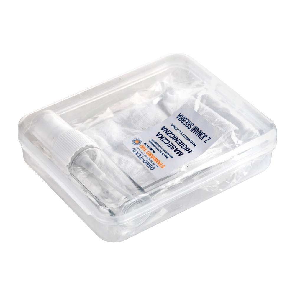 Zestaw w przezroczystym pudełku, butelka 15 ml na płyn do dezynfekcji, maseczka wielokrotnego użytku z jonami srebra, niemedyczna, posiada miejsce na filtr, wykonana w 100% z poliamidu 250 g/m2, jony srebra utrzymują się do 20 prań, temperatura prania do 90 stopni Celsjusza, wyprodukowana w Polsce