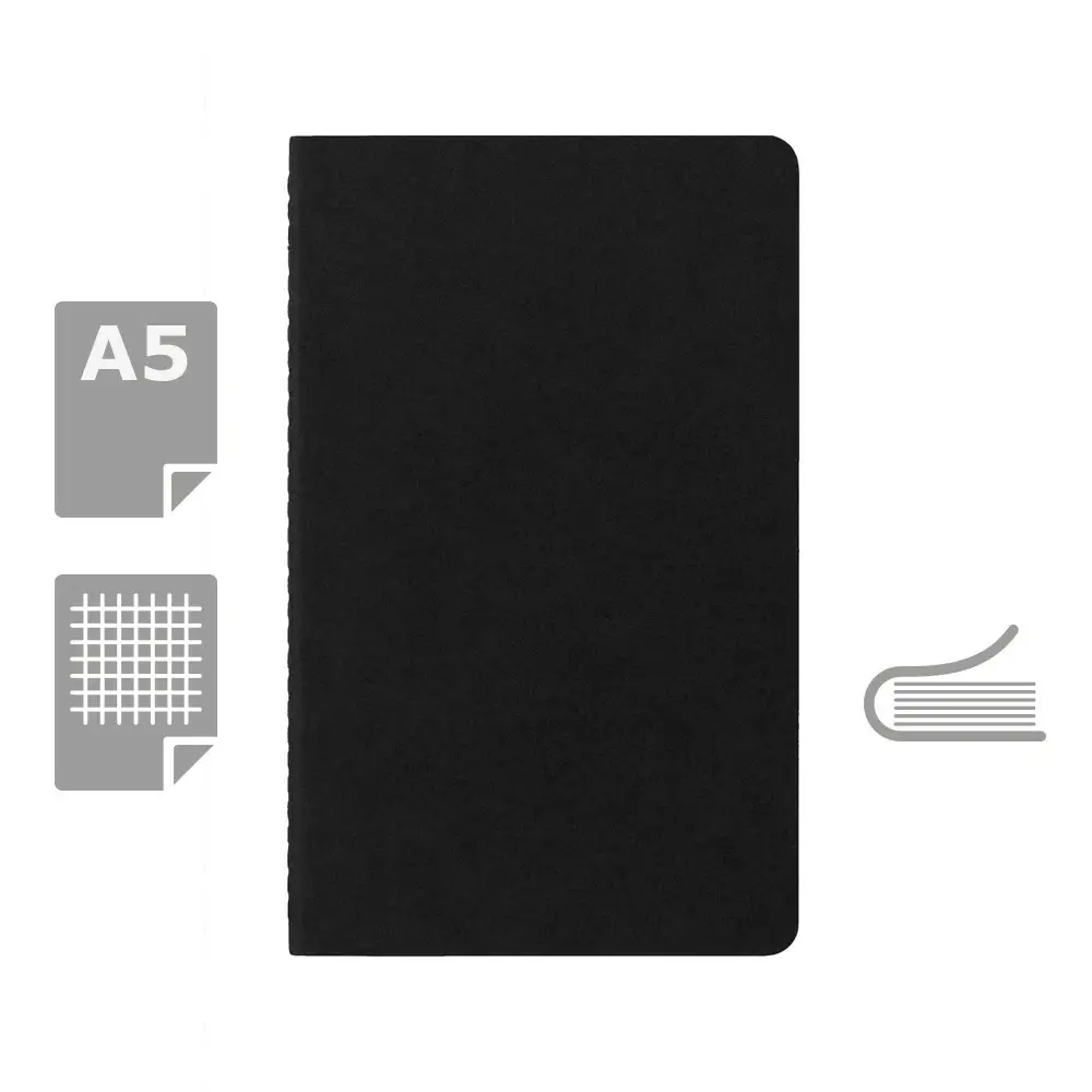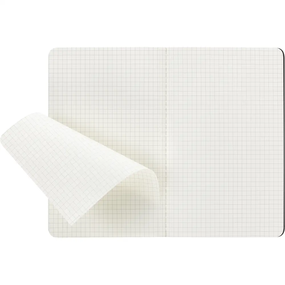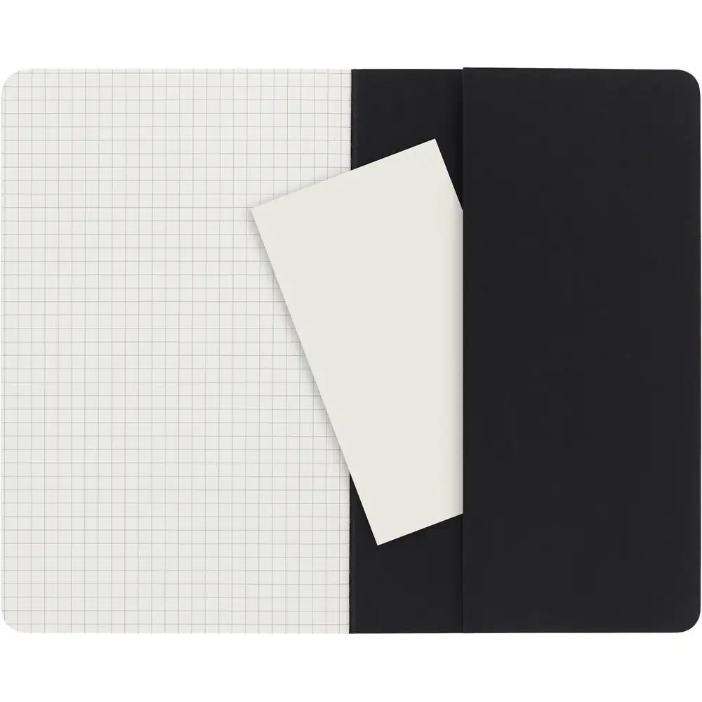 Duży zeszyt MOLESKINE Cahier Journal (ok. A5, large), 80 stron w kratkę, miękka okładka z widocznymi przeszyciami na grzbiecie, kieszeń wewnętrzna, 16 kartek z perforacją umożliwiającą wyrwanie na końcu