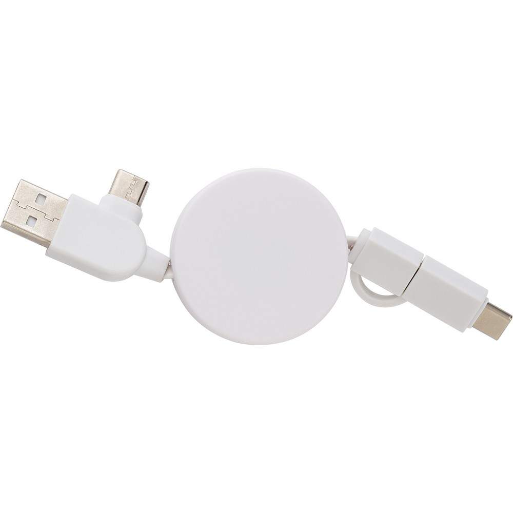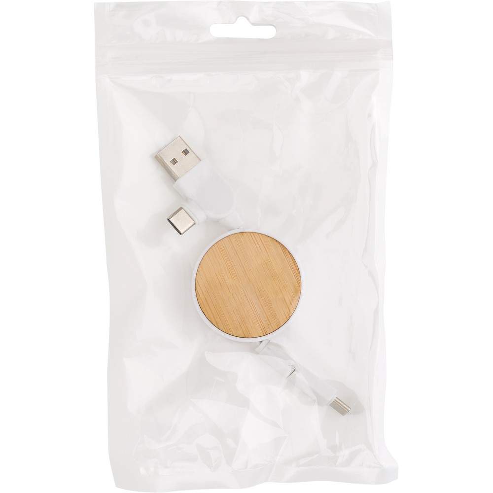 Zwijany kabel do ładowania z 4 końcówkami: USB, 2x USB typu C oraz kompatybilna z urządzeniami iOS, elementy z bambusa